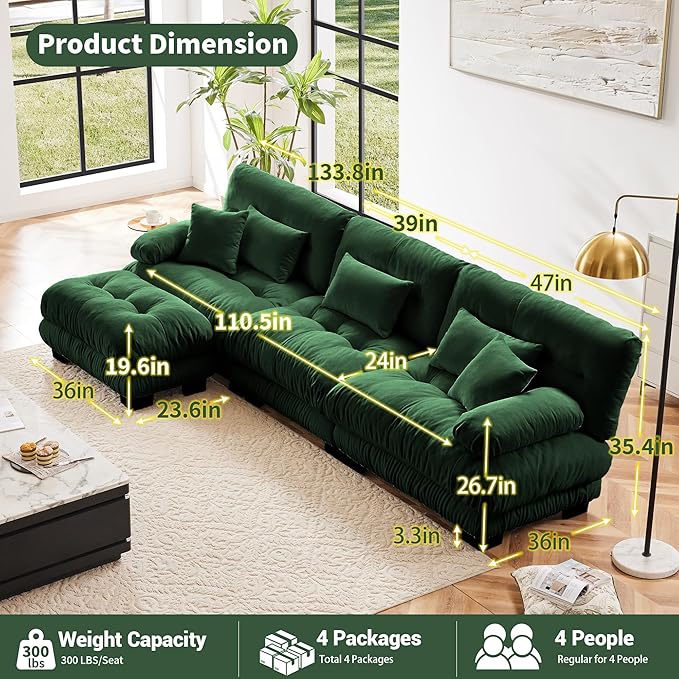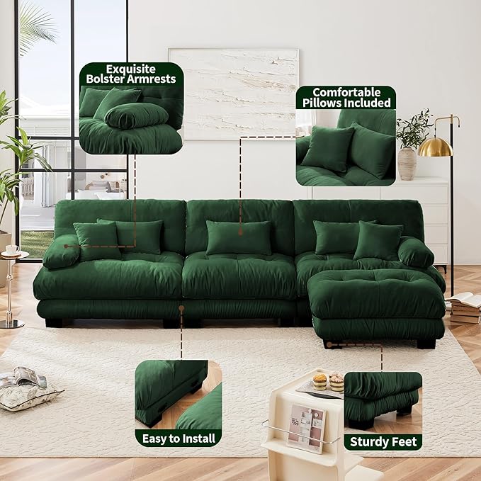 Modular Sectional Sofa, Comfy Cloud Couch 3 Seater Couch with Ottoman, Sectional Couches for Living Room, Modern Chenille L Shaped Couches, Sleeper Deep Seat Sofa with Throw Pillows, Green