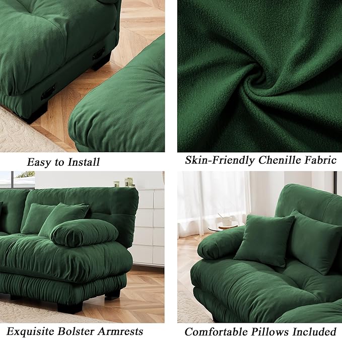 Modular Sectional Sofa, Comfy Cloud Couch Oversized Loveseat, Sectional Couches for Living Room, Modern Chenille Couch for Bedroom, Sleeper Deep Seat Sofa with Throw Pillows, Green