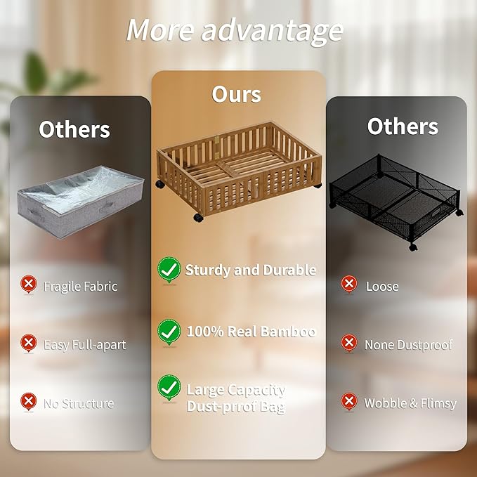 - Easy Assembly & Fit Most Beds: Simple assembly required, and the compact design fits under most standard beds. Transform the wasted space under your bed into a functional storage area with these bamboo under bed storage units.