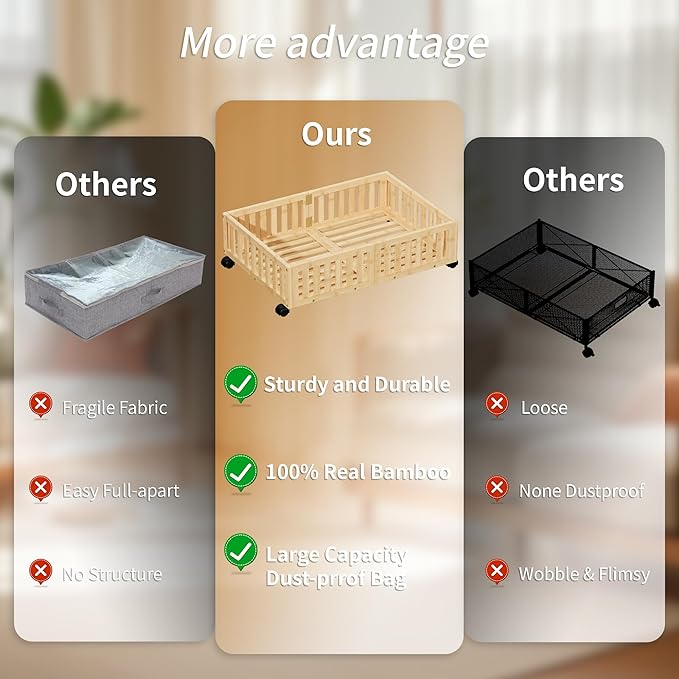• Easy Assembly & Fit Most Beds: Simple assembly required, and the compact design fits under most standard beds. Transform the wasted space under your bed into a functional storage area with these bamboo under bed storage units.