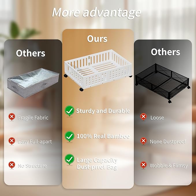 • Easy Assembly & Fit Most Beds: Simple assembly required, and the compact design fits under most standard beds. Transform the wasted space under your bed into a functional storage area with these bamboo under bed storage units.