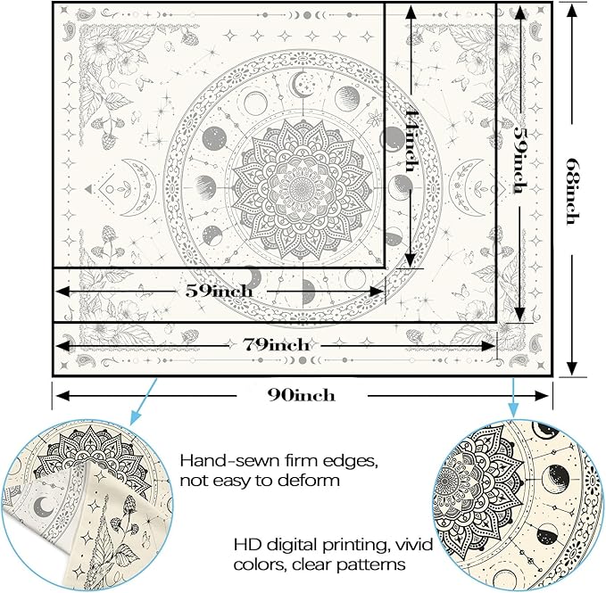 - Unique Mandala Moon Design: This Lunerfex tapestry features an intricate mandala design combined with cosmic elements, creating a mysterious and artistic touch for your bedroom or living room.