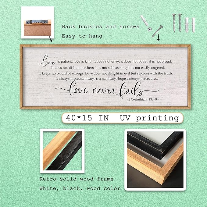 LuZhiQiang Love is Patient Love is Kind Wall Decor 40"X15" Bible Verse Quote 1 Corinthians 13 For Bedroom Above Bed Christianity Couple Sign Large Wood Framed Wall Hanging Art (Wood)