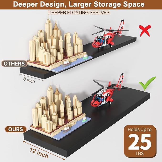 - 【Extra Deep 12" Storage】- These deep floating shelves for wall provide 12-inch depth for generous storage of books, decor, and kitchen essentials. Their expanded surface area maximizes organization while keeping items within easy reach. Perfect for displaying collectibles or storing daily necessities!
