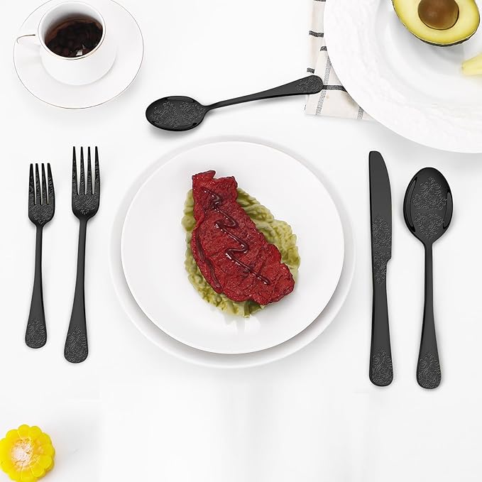 - WONDERFUL WORKMANSHIP AND FUNCTIONAL---Our black utensils set is made of multiple mirror polishing treatment,black silverware set with floral design Each piece is beautifully adorned with a delicate floral pattern,edge smooth , elegant and classical appearance, adding to the beautiful experience of everyday dining.