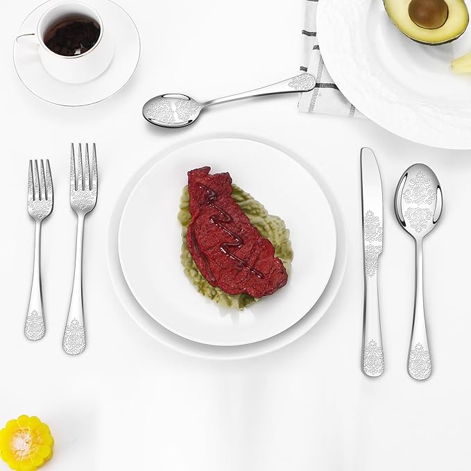 - WONDERFUL WORKMANSHIP AND FUNCTIONAL---Our utensils set is made of multiple mirror polishing treatment, silverware set with floral design Each piece is beautifully adorned with a delicate floral pattern,edge smooth , elegant and classical appearance, adding to the beautiful experience of everyday dining.