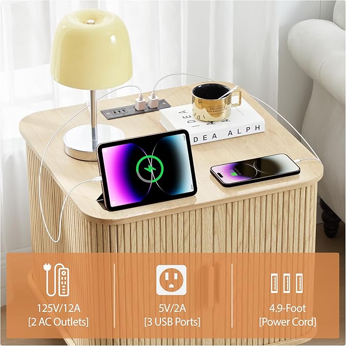 AVZEAR 24" Large Square End Table with Charging Station, Farmhouse Fluted Sofa Side Table with Sliding Tambour Door & Storage, Curved Rustic Wood Nightstand for Living Room, Bedroom, Natural