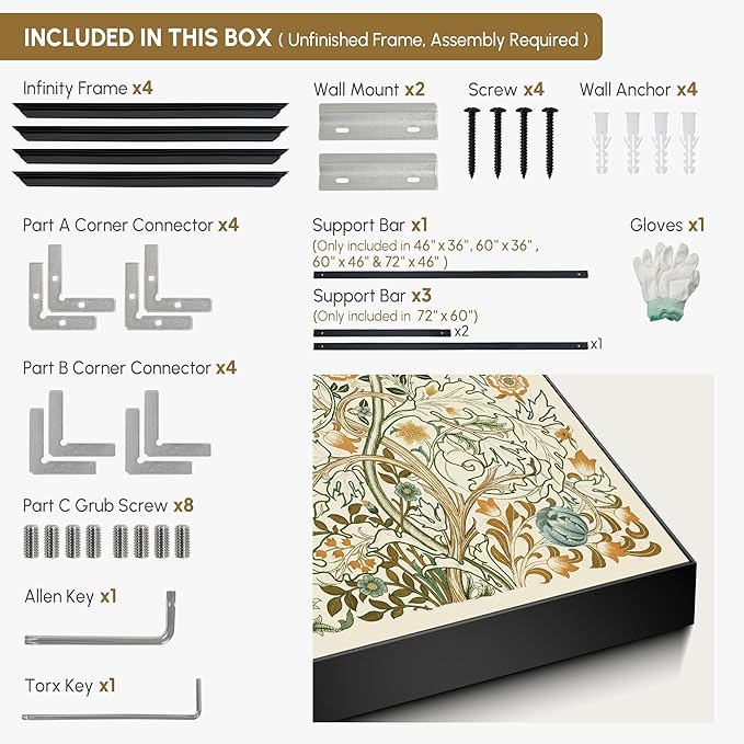 - Assembly Required: The artwork comes with the frame components unassembled. Don¡¯t worry ¡ª setup is straightforward and tool-friendly. For best results and accurate alignment, we recommend two people to ensure a smooth assembly and a stable, secure wall mount.