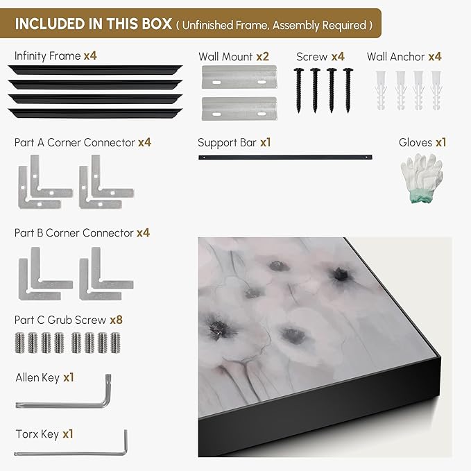 - Assembly Required: The artwork comes with the frame components unassembled. Don¡¯t worry ¡ª setup is straightforward and tool-friendly. For best results and accurate alignment, we recommend two people to ensure a smooth assembly and a stable, secure wall mount.