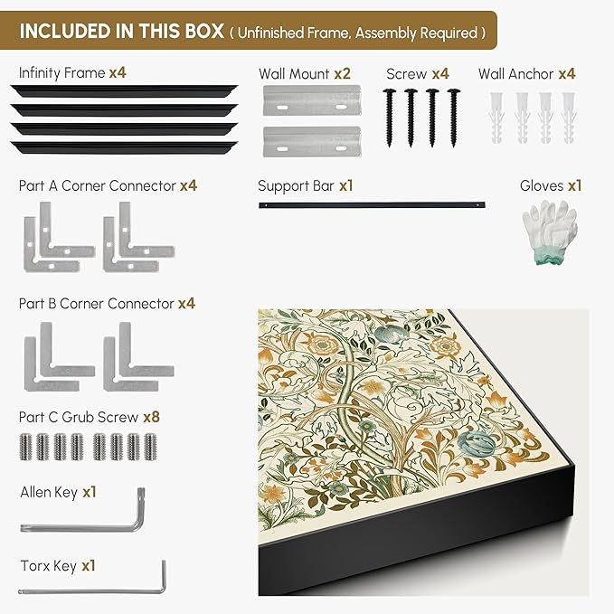 - Assembly Required: The artwork comes with the frame components unassembled. Don¡¯t worry ¡ª setup is straightforward and tool-friendly. For best results and accurate alignment, we recommend two people to ensure a smooth assembly and a stable, secure wall mount.