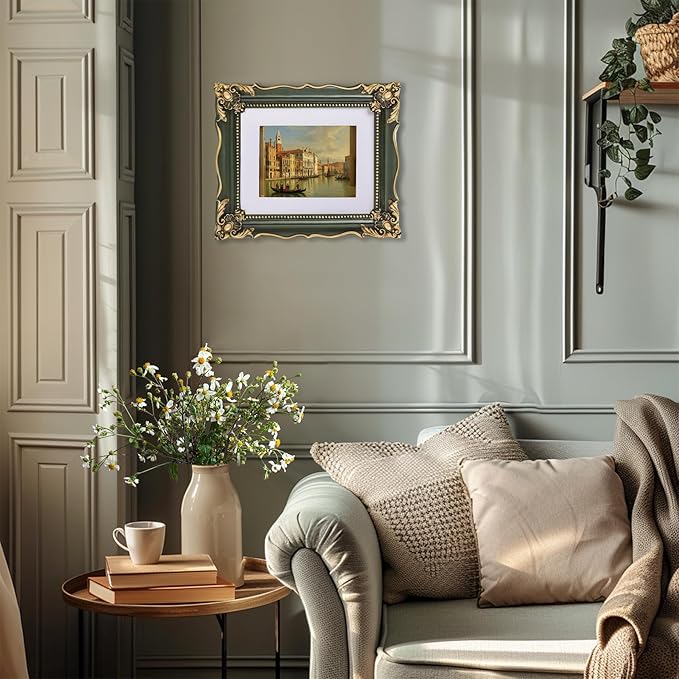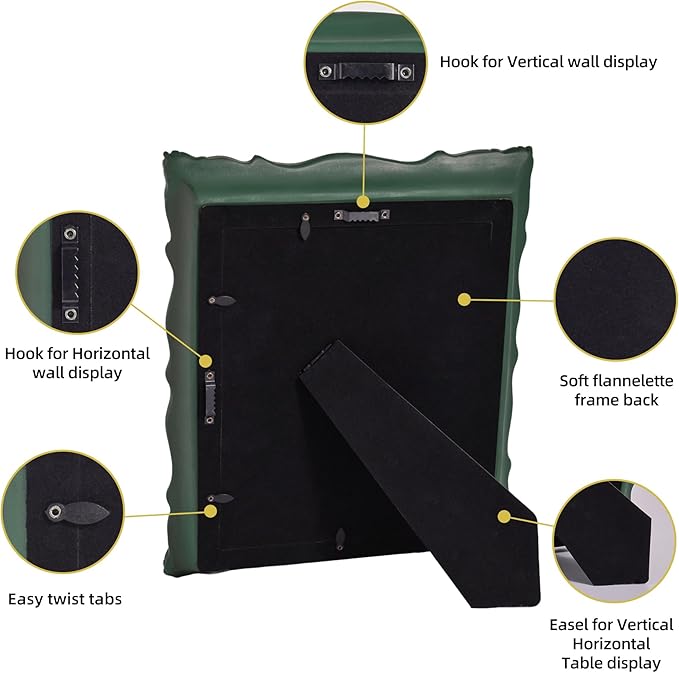 - Easy to Display: This 8x10 green ornate frame comes with a removable white mat and a decor picture. The white mat can be entirely removed for 8x10 paintings or keep it for 5x7 paintings, perfect to display any photos or paintings. The back of frame is a soft velvet back plate equipped with a easel and two-way serrated hook, which can be displayed on tabletop or hang on the wall in vertically or horizontally.