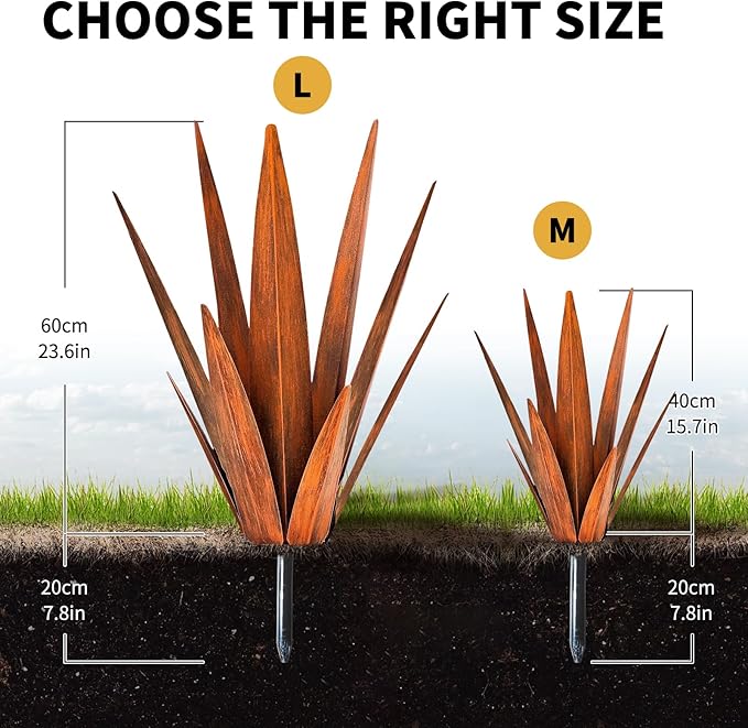 Metal Agave Plants, Tequila Rustic Sculpture, Metal Yard Art, Outdoor Lawn Ornaments Yard Stakes (Rusty- L)