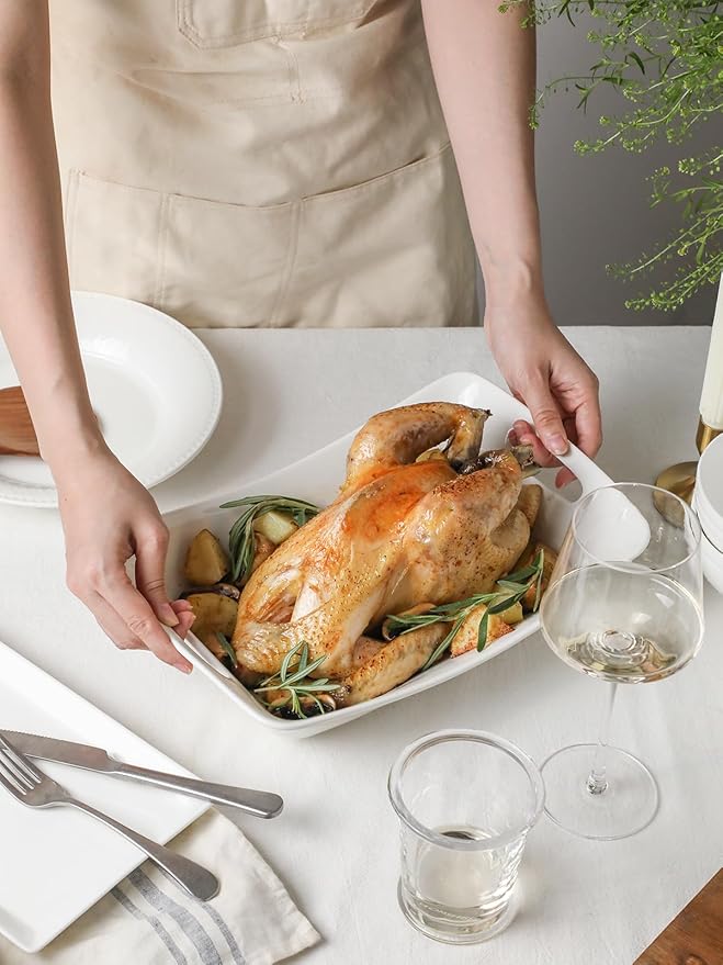 - No-Spill Design & Space-Saving - Designed with the perfect depth to securely hold juicy roasts, saucy pastas, and gravy-laden dishes without mess. This set includes two serving platters, they can stack neatly for compact storage, saving valuable cupboard space.