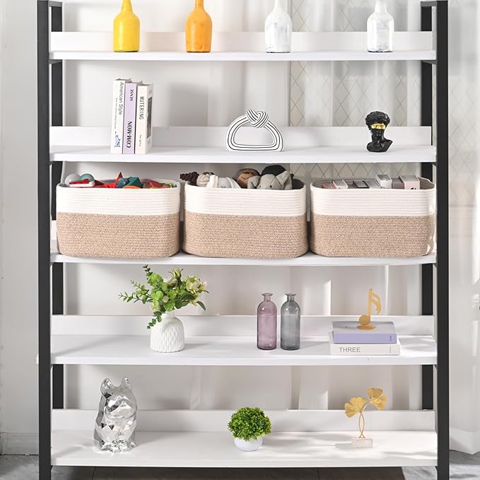 Large Storage Baskets for Organizing Shelves, Woven Cotton Rope Bins for Baby Nursery Organization, Book Toy Towel Organizer, 17"x13"x9.5", 3 Packs, Off White & Brown