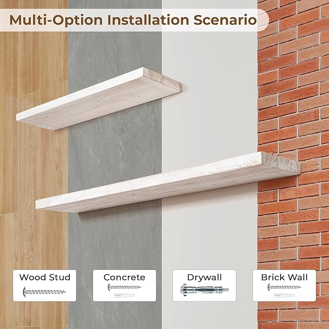 - SMART MOUNTING SYSTEM: Axeman storage wall shelves have a heavy-duty hidden bracket that can be easily installed into wall studs, with each solid wood floating wall shelf capable of holding up to 45 lbs. The flush mount design ensures that the metal brackets are invisible after installation, while screws at the bottom secure the floating shelves from sliding off
