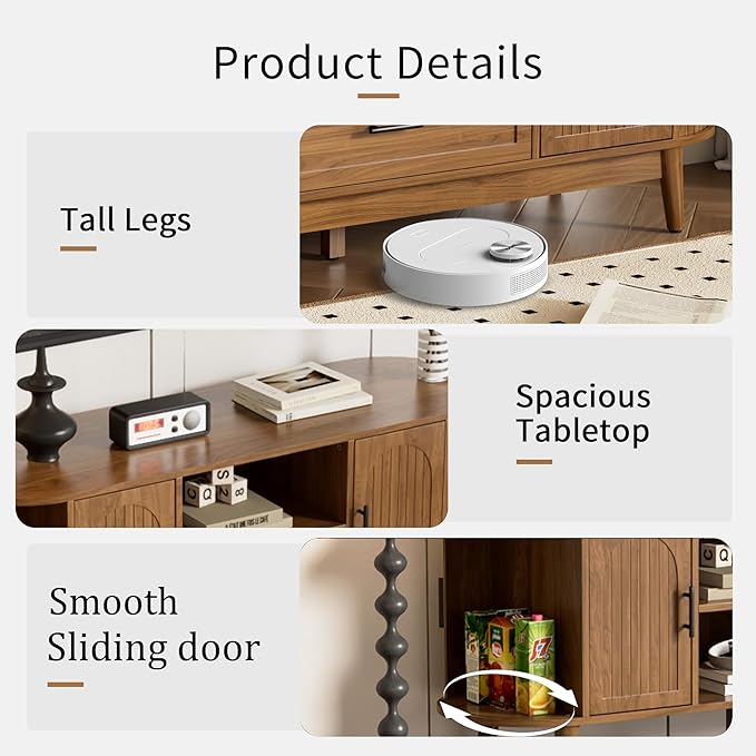 - Elegant TV stand: This mid-century modern style TV stand features curved sliding doors and arched doors, decorated with grooved vertical stripes and metal black handles. The unique design style adds a touch of elegance to the living room or bedroom. It is easy to operate, and the curved design is safer, reducing the risk of accidental collisions, making it an ideal furniture choice for improving the happiness index of the home