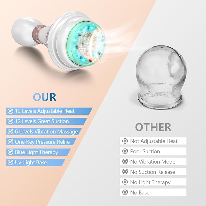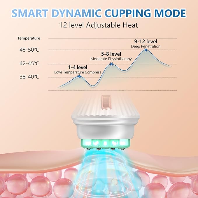 - [New Upgraded Device]:This cupping set is fully upgraded, 12 adjustable suction, 12 adjustable hot compress, 6 level vibration massage, more intelligent and convenient. The product comes with a base to make it cleaner for you to use.