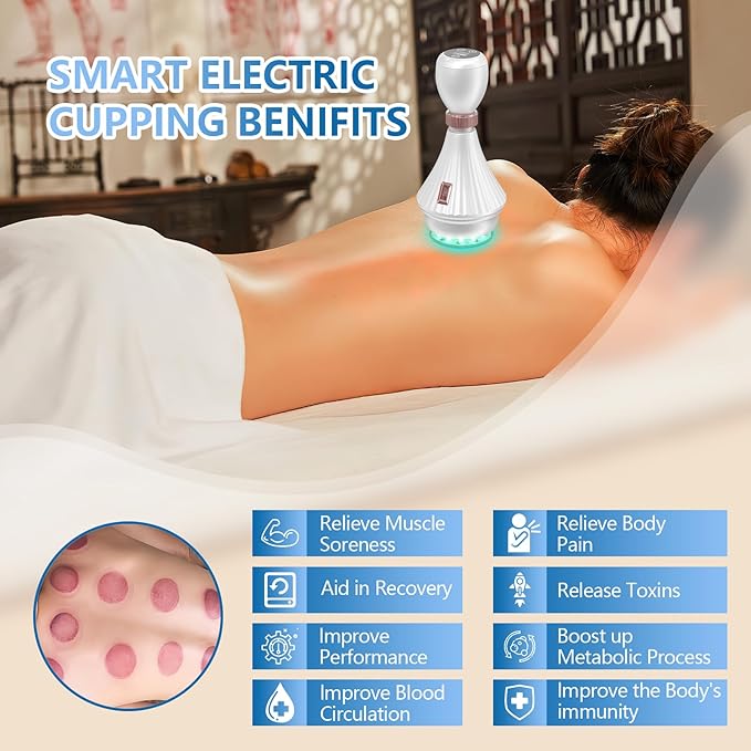 - [Cupping Therapy Benefits]: Suction cupping promotes circulation while drawing toxins to the skin and relieving your body of inflammation. Traditionally this is done at spas but with our electric cupping massager you can do it anywhere.