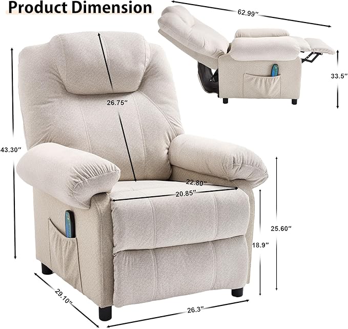 - Small Recliners for Small Spaces: Measuring 43.3"H x 26.3"W x 29.1"D, this beige recliner chairs are ideal for small spaces. Whether used as RV recliners, placed in a spacious living room, or tucked into a corner of a room, It all blends with any perfect occasion