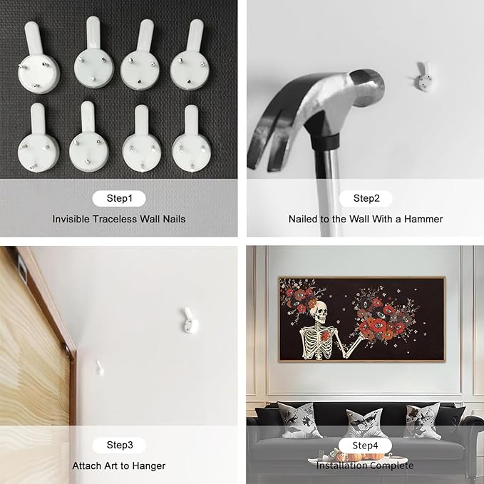 - [Easy To Hang] This dark Gothic skull wall art measures 24x16 inches (100x50 cm) and is very easy to hang.Just first determine where you want to hang it,then secure the nails and hang the frame on the nails.It only takes a few minutes to install successfully
