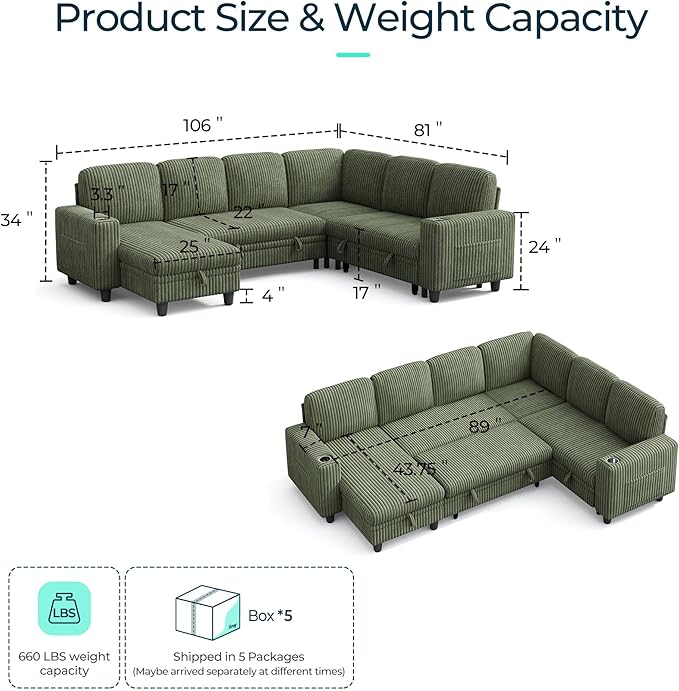 LINSY HOME Sectional Sleeper Sofa with Pull Out Couch Bed Convertible Plush Corduroy Cloud Couch with Storage Chaise & USB Charging, Comfy Modular Couches for Living Room (Green)
