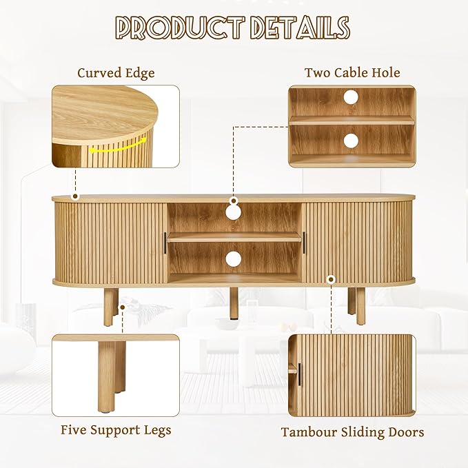 54" Tambour Door TV Stand,Wood Mid Century Modern TV Cabinet for Up to 65“ TV,Curved Edge Long TV Stand with Storage for Bedroom Living Room(Natural, 54inch)