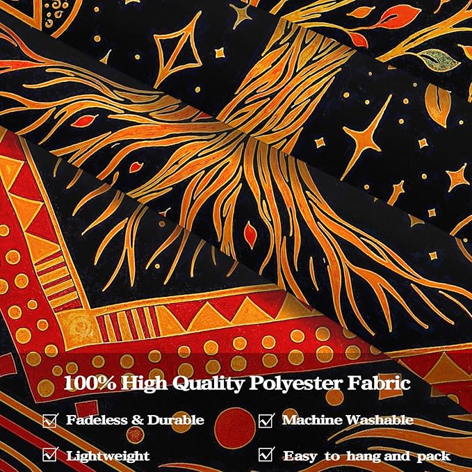 - Symbolic Cosmic Design: Features a central Tree of Life surrounded by sun, moon, and star motifs, adorned with intricate patterns in rich, contrasting colors.