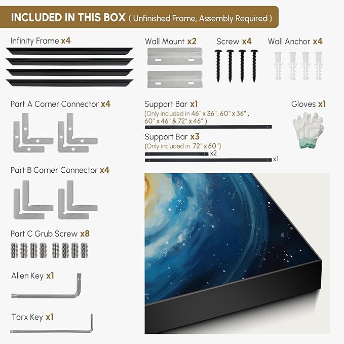 - Assembly Required: The artwork comes with the frame components unassembled. Don¡¯t worry - setup is straightforward and tool-friendly. For best results and accurate alignment, we recommend two people to ensure a smooth assembly and a stable, secure wall mount.