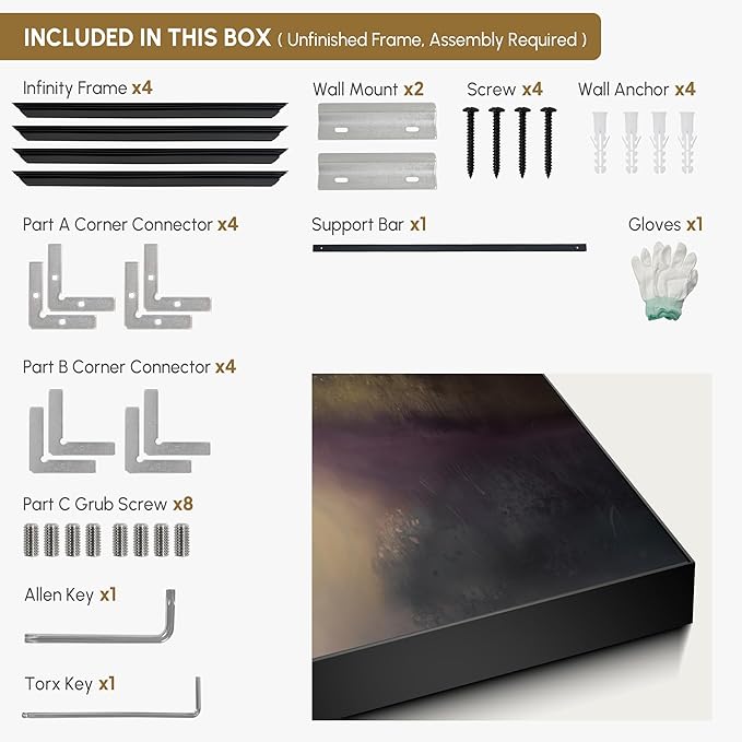 - Assembly Required: The artwork comes with the frame components unassembled. Don¡¯t worry - setup is straightforward and tool-friendly. For best results and accurate alignment, we recommend two people to ensure a smooth assembly and a stable, secure wall mount.