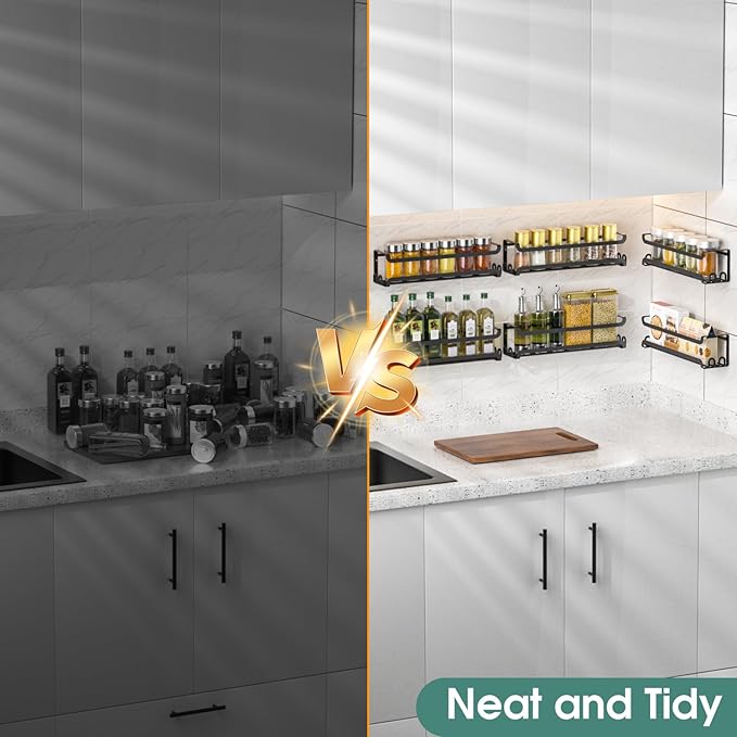 - Stable Guardrail & Wider Adhesive Stickers - Our spice rack organizer for cabinet door added side guards and improved two-in-one wider adhesive stickers for increased safety and stability. The adhesive spice racks have guard rails prevent spice from falling, while the wider and stronger stickers provide extra protection and peace of mind in your busy kitchen