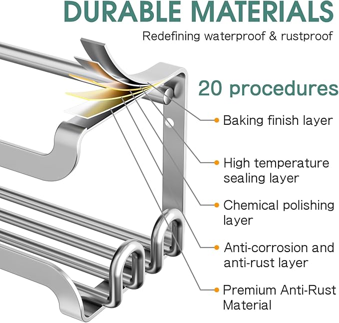 LUCYCAZ 2 Pack Wall Mounted Spice Rack with 16 Hooks, Spice Organizer Shelf for Stove Cabinet Pantry Door,Screw or Adhesive Spice Shelf Hanging Wall Spice Rack in Kitchen and RV (Silver, 2 PACK)