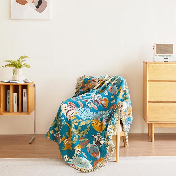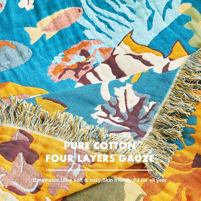 MSGKV Throw Blanket for Couch Bed Cotton Muslin Breathable Cute Ocean Animals Twin Size Blanket 60"x80" for All Seasons Lightweight Farmhouse Blankets