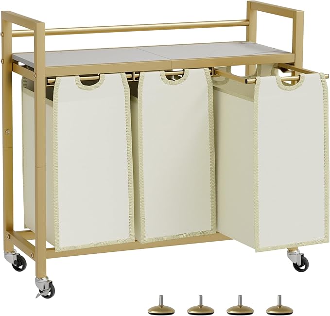 Laundry Hamper, Laundry Basket, Laundry Sorter with 3 Removable Bags, Clothes Basket with 3 Compartments, Wheels, Shelf for Laundry Room Bathroom Bedroom (3 Bags-Golden)