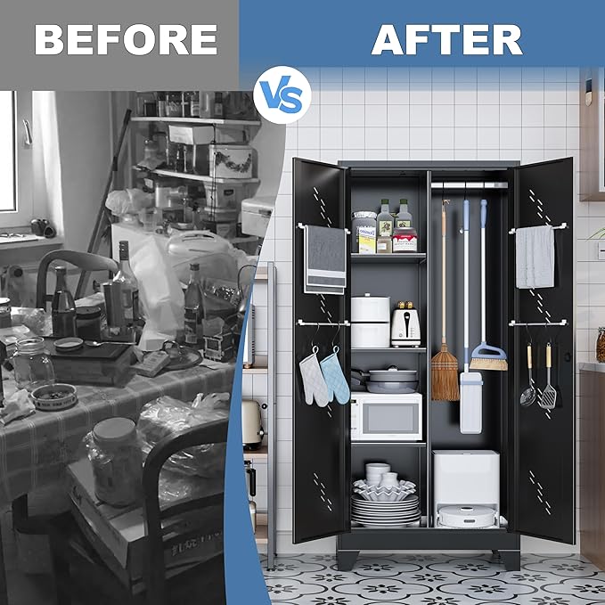 - Ample Storage Space: This garage tool storage cabinet includes shelves and a hanging rod with S-hooks, providing ample space to organize everything from mops and brooms to towels and documents. Keep your essentials tidy and easily accessible