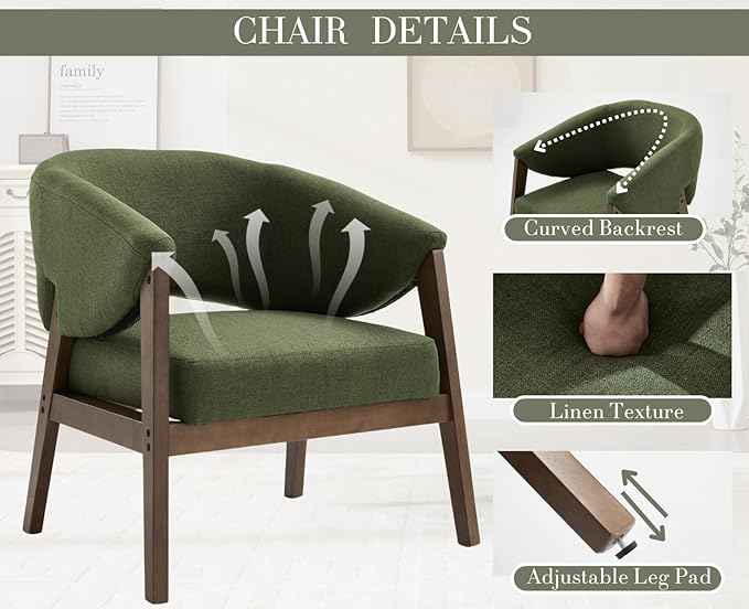- [Stylish & Breathable Fabric -Sit Pretty, Stay Cool]-Wrapped in a soft, breathable linen-blend fabric, this chair feels as good as it looks. The deep green pairs beautifully with the walnut wood legs, adding a fresh pop of color to any room.