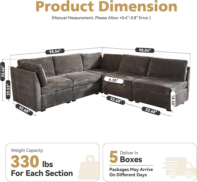 - One Package Per Seat:The modular sofa comes with 5 boxes and may arrive at different dates. Each box is designed and packaged to maximize shipping efficiency and fits narrow staircase and elevator. Armchair Size: 32.7" W x 28" D x 33.5" H; Ottoman Size: 32.7" W x 32.7" D x 18.5" H. Weight Capacity: 330 lbs / Seat. There may be slight color differences due to light or monitor.