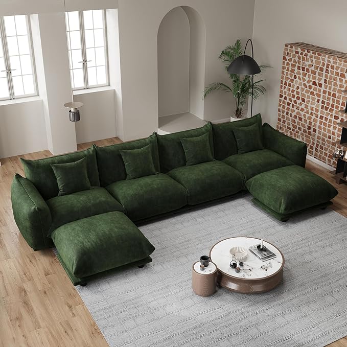 Modern Minimalist Chenille Modular Sectional Sofa, Oversized Deep-Seat U-Shaped Couch with Movable Ottoman, Thick Cushions, Upholstered Sofa for Living Room, Bedroom, Office, Apartment Green 2 Ottoman