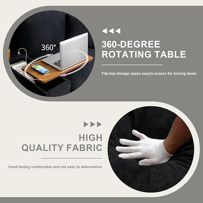 120.3" Modern L-Shaped Sectional Sofa with 360°Swivel Drop-Down Table, Storage Armrest, USB Ports & Movable Storage Ottoman – Plush Linen Cloud Couch for Lounge (Black)