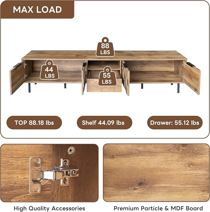 - Durable & Well-Constructed – Built from high-grade engineered wood and supported by sturdy metal legs, this TV cabinet ensures stability and long-lasting use, while the elevated base helps with airflow and easy floor cleaning.