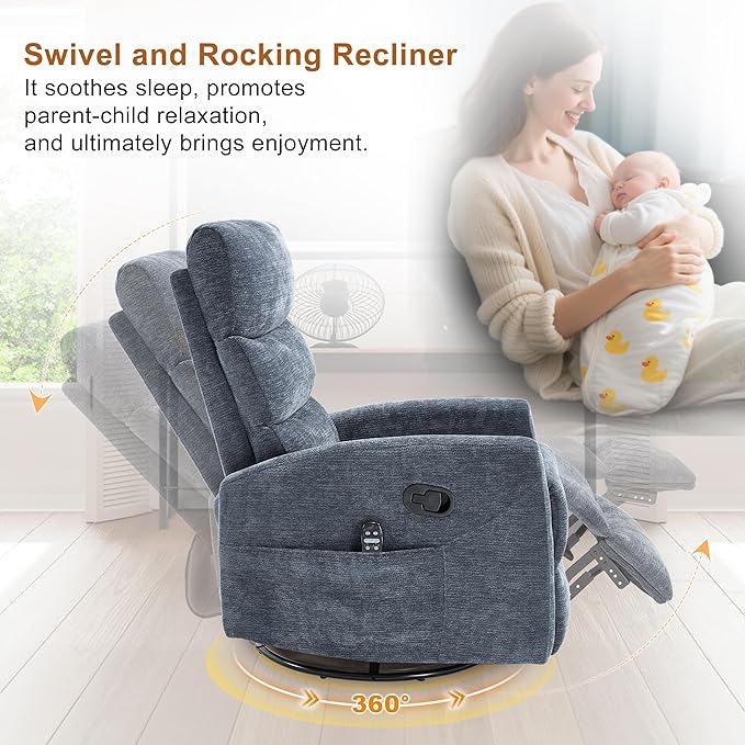 - [Affordable Quality] The swivel glider recliner is overstuffed with Medium-density sponge to provide you with great softness. The manual swivel rocking chair is upholstered with high-quality fabric, which is durable and breathable, with a good touching.