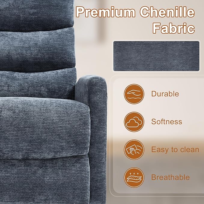 Manual Swivel Rocker Recliner Chair for Adults, Overstuffed Reclining Glider Chair for Nursing with Vibration Massage & Heat, Living Room Rocking Recliner 3-Stage backrest, Chenille Fabric Blue