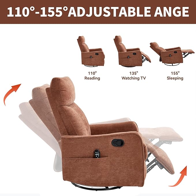 - [Affordable Quality] The swivel glider recliner is overstuffed with Medium-density sponge to provide you with great softness. The manual swivel rocking chair is upholstered with high-quality fabric, which is durable and breathable, with a good touching.