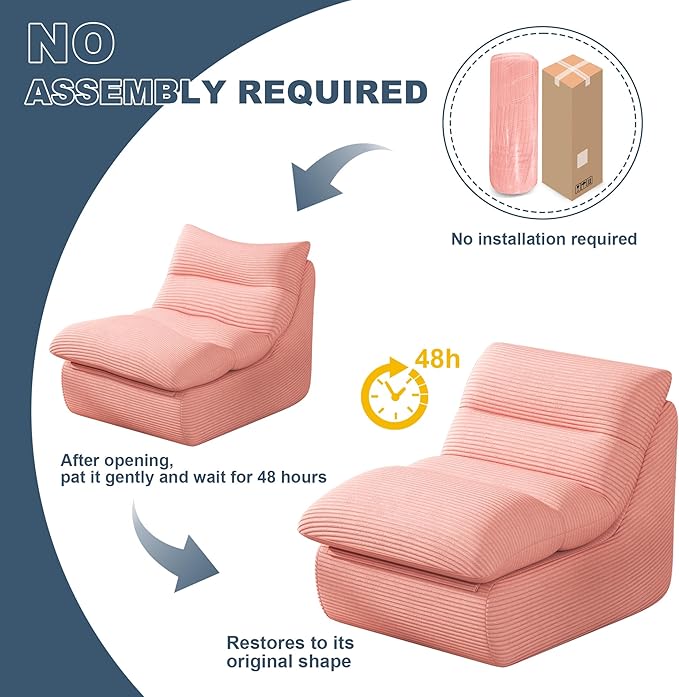 - 【No Assembly Required】There is no need to assemble the beanbag, just open the compressed package and allow it 24-48 hours to regain resilience. After total expansion, you can recline and relish a fantastic time. It's chill to kick back and it's great for watching TV, reading books and even family time. Due to compressed packaging, the fabric may have wrinkles upon opening. Let it sit for 24-48 hours to reach its optimal state. Afterward, you can gently smooth out the fabric or lightly iron it for a more polished look.