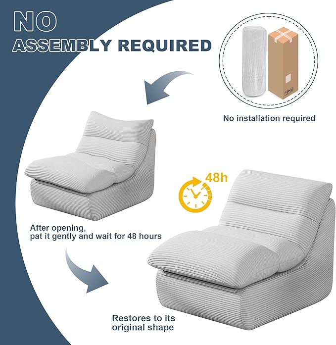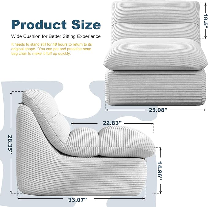- 【No Assembly Required】There is no need to assemble the beanbag, just open the compressed package and allow it 24-48 hours to regain resilience. After total expansion, you can recline and relish a fantastic time. It's chill to kick back and it's great for watching TV, reading books and even family time. Due to compressed packaging, the fabric may have wrinkles upon opening. Let it sit for 24-48 hours to reach its optimal state. Afterward, you can gently smooth out the fabric or lightly iron it for a more polished look.