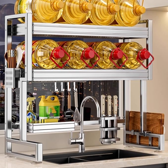 - Large Capacity with Multi-Functional Compartments: This over the sink dish drying rack features spacious storage and is thoughtfully divided into multiple compartments, making it easy to organize dishes, pots, spice bottles, and other kitchen items. The multi-functional divisions not only enhance storage efficiency but also keep your kitchen neat and orderly, meeting various kitchen storage needs.