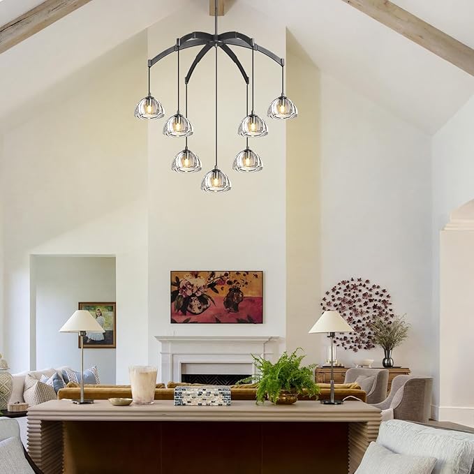 - Sleek Round Modern Design: The circular Black frame and seven transparent glass shades create a minimalist yet bold statement. Ideal as a modern chandelier or round chandelier, its clean lines add architectural sophistication to any space.